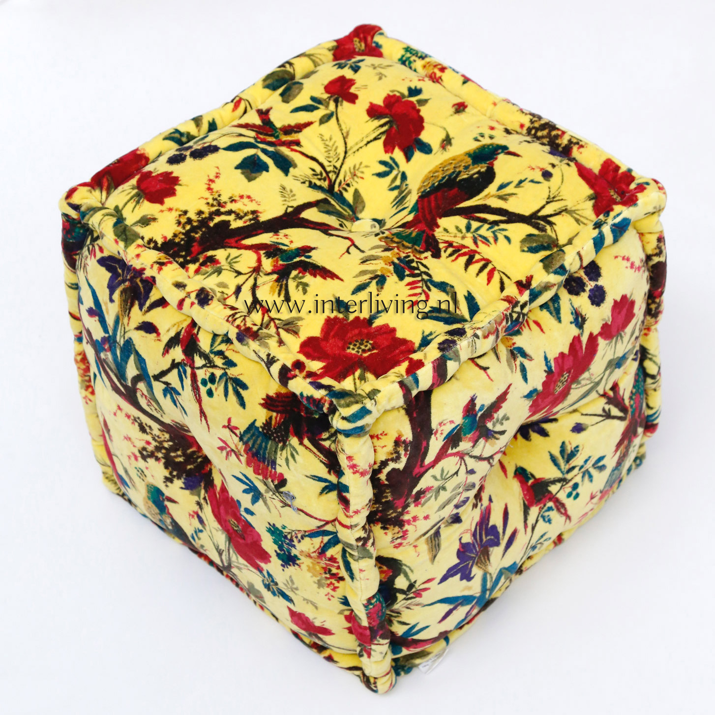 Een bohemian chic velours kussen en poef met vogels en bloemen – blauw, groen, paars, roze en geel