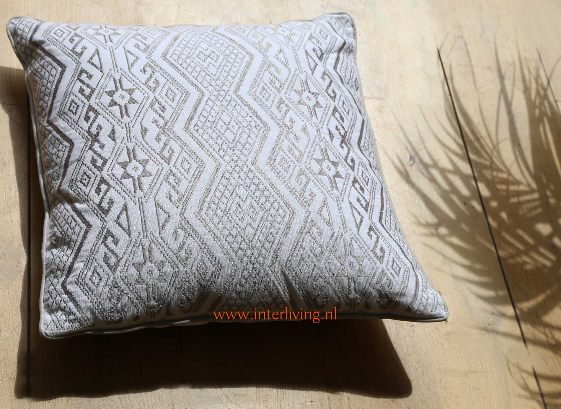 Deze nieuwe kussens passen echt overal bij: een nieuwe zomerse kussen collectie in zachte naturel tinten met een bijzondere tribal aztec glam borduurwerk stijl voor een basic boho stijl interieur. Dit grote katoenen geometrisch sierkussen van 50 cm heeft de textuur van geweven linnen met een metallic glanzende geometrische ethnic tribal patroon. De kussens horen bij een nieuwe serie, binnenkort zijn ze ook in andere afmetingen verkrijgbaar in de webshop.