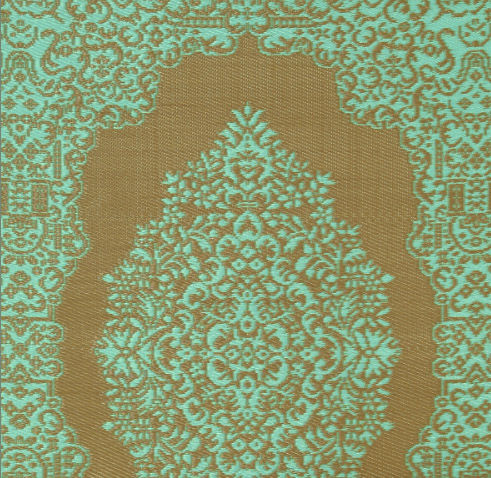 Het stijlvolle oosterse buitenkleed met turquoise / blauw / groen / brons tinten en oosterse motieven kan prachtig binnen worden gebruikt, zoals hier bij een eiken houten vloer, zonder dat het goedkoop overkomt!