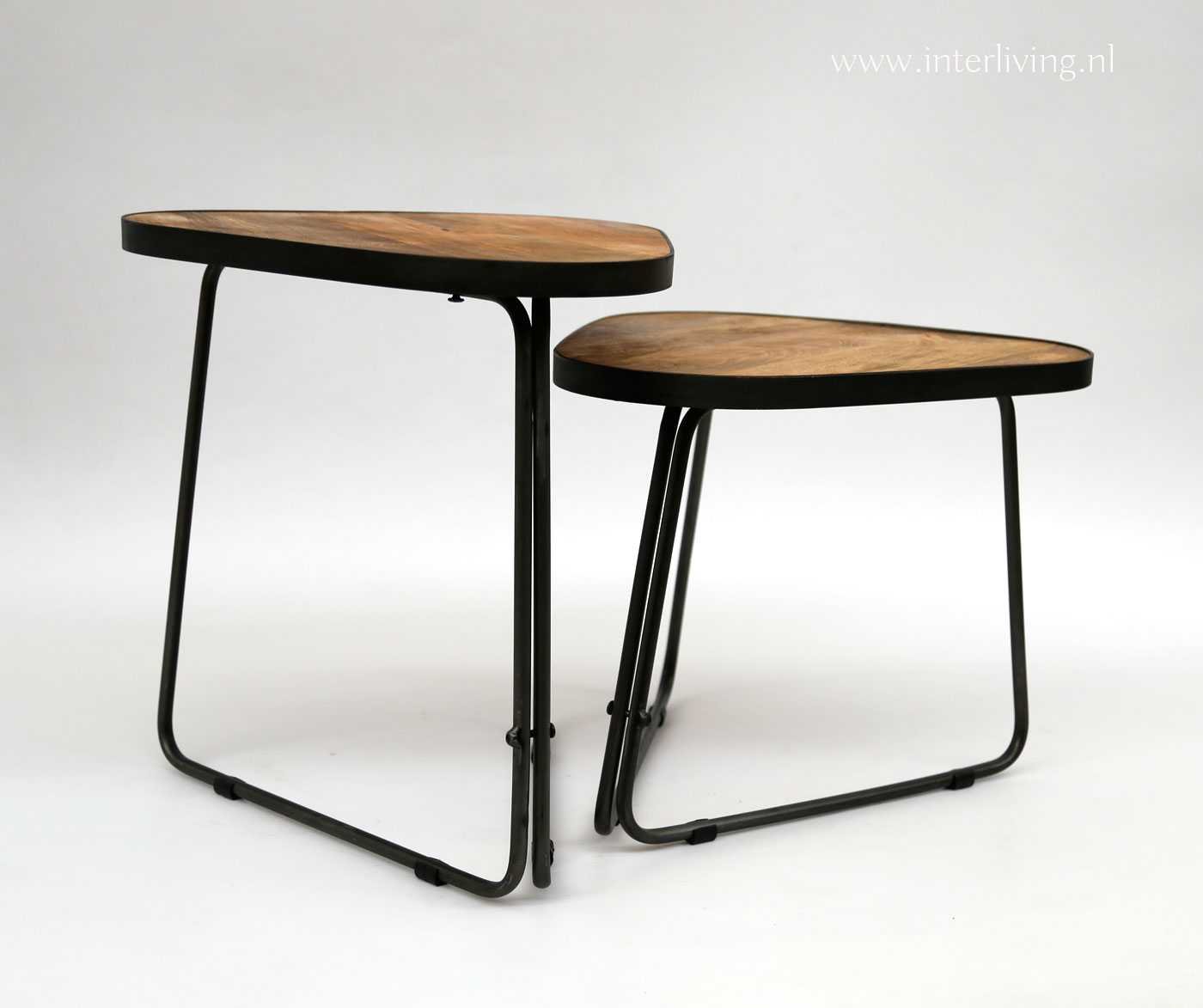 Dit setje bijzettafeltjes heeft een mangohouten blad en een zogenaamd “driepoot” metalen frame. Ze passen mooi in een industrieel interieur en zijn goed te combineren met onze andere woonitems van mangohout.