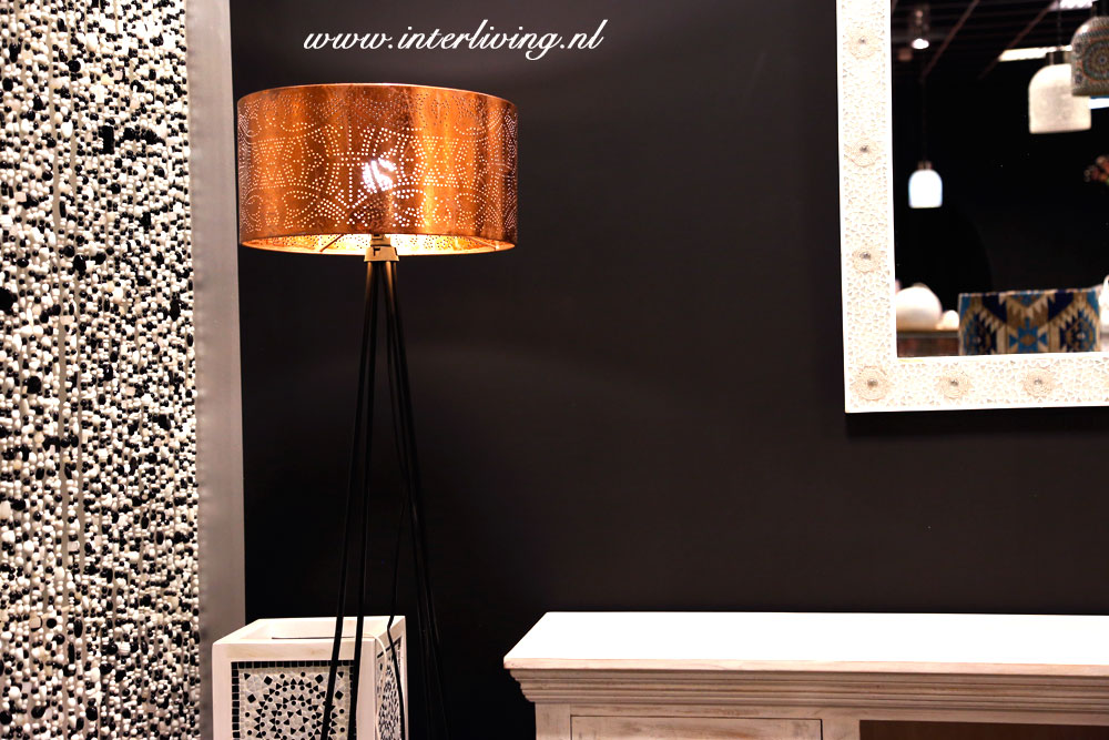De sfeerfoto’s die we pas hebben gemaakt laten dit goed zien. In deze setting van whitewashed meubeltjes, een zwarte muur, een witte spiegel en een zwart met wit kralengordijn, komt onze filigrain lampenkap van vintage koper echt zeer goed tot zijn recht. Wat ons betreft een plaatje waar je maar naar blijft kijken!