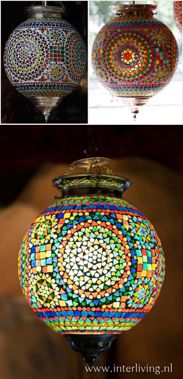 (bovenstaande lamp is de Ibiza bol hanglamp met gekleurd glas mozaïek (25 cm))