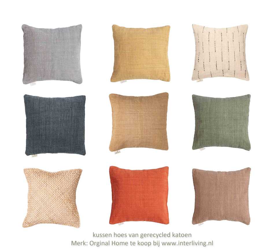 Deze kussenhoezen (zie hieronder) van het groene interieur merk Original Home zijn gemaakt van gerecycled katoen. Dit “afvalkatoen” is afkomstig van overgebleven katoenvezels uit de katoenindustrie in Indonesië. Ook heel leuk zijn de kussens van bananenblad: het perfecte “natuur statement” op je bank of stoel!