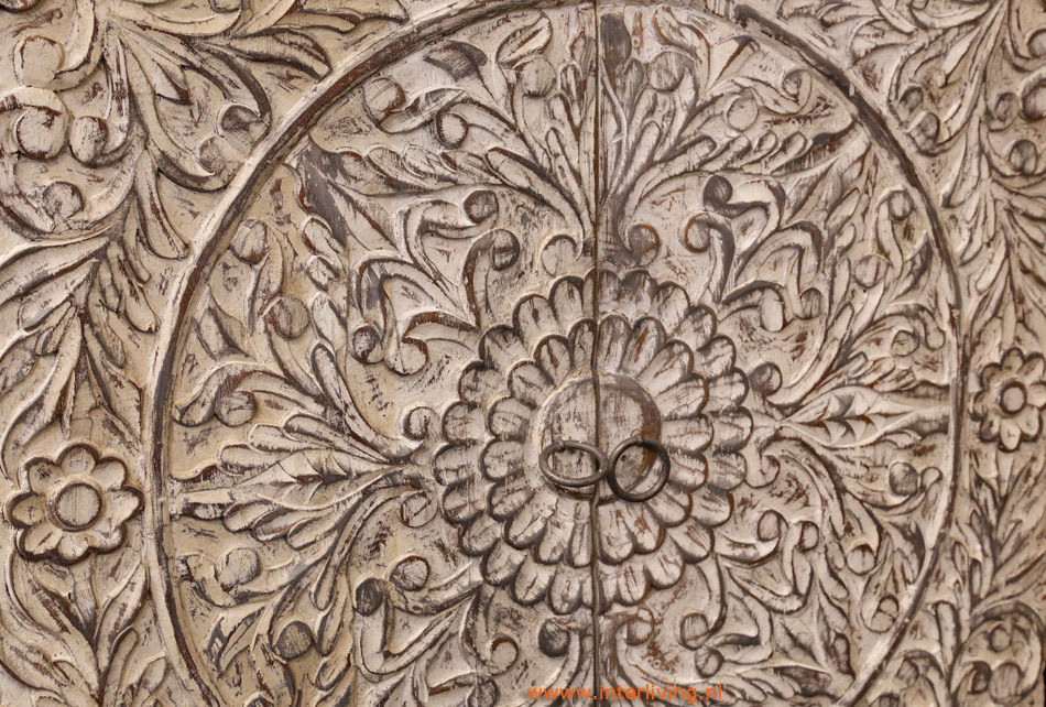 Daarnaast hebben we een collectie mango houten meubelen met symmetrisch lotus houtsnijwerk in de panelen verwerkt in een white washed uitvoering: een tvkast, een tweedeurs (kabinet) kast of een vierdeurs dressoir. Mooi symbolisch ontwerp, brengt rust en balans in je huis.