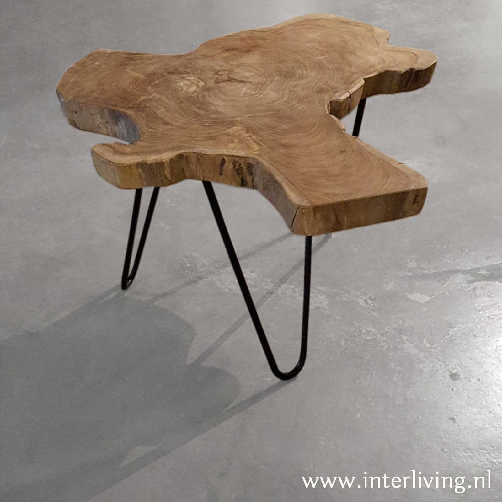 Salontafel van teak root design: klein boomstam tafelblad met hairpin stalen poten – landelijk & industrieel