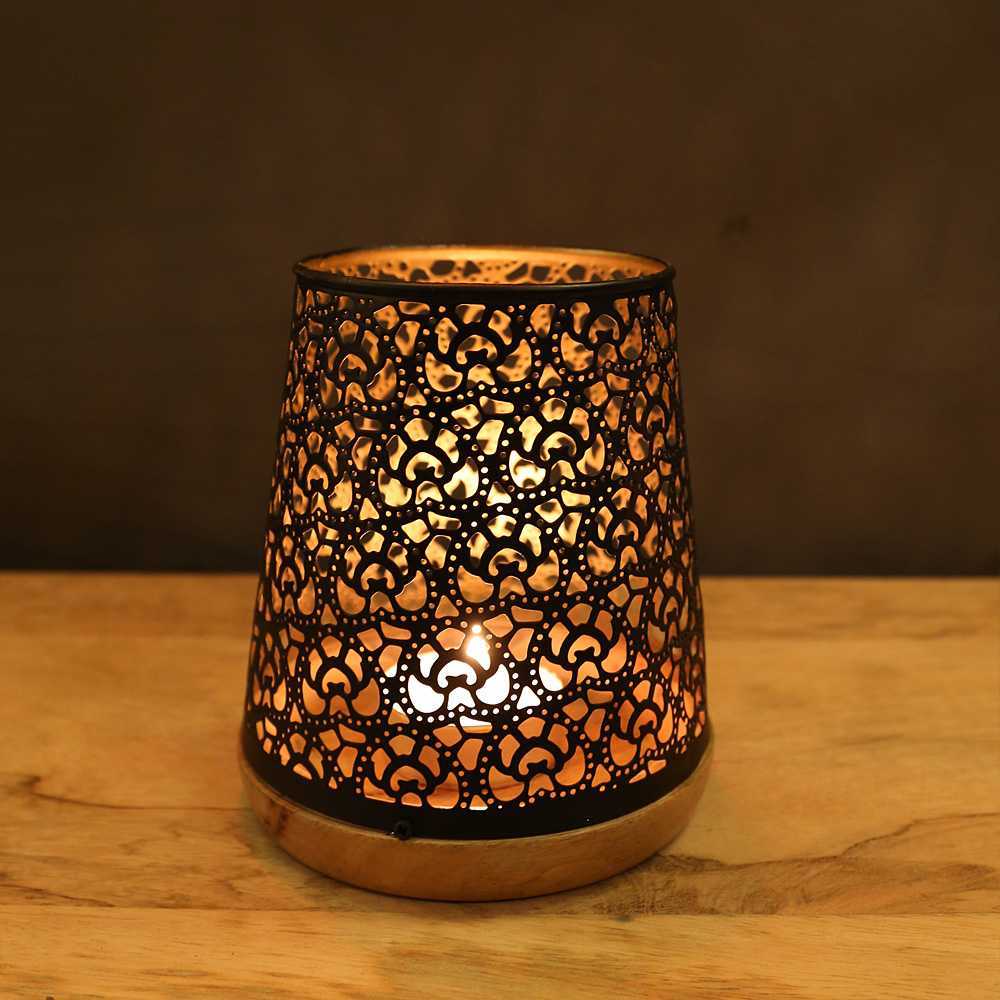 De massief (mango)houten voet met daarop zwart metaal maakt het ontwerp van deze lantaarns industrieel. De diepzwarte tint straalt moderniteit uit, terwijl de sublieme oosterse patronen een vleugje mystiek toevoegen. Plaats een (groot) waxinelichtje in de houder en zie hoe de filigrain patronen prachtige schaduwen op je muur creëren, waardoor een sfeer van magie en sereniteit ontstaat. We zeggen hierbij “groot”, omdat de grote waxinelichtjes die ook wel in de horeca worden gebruikt het meeste licht en daarmee de meeste sfeer geven.